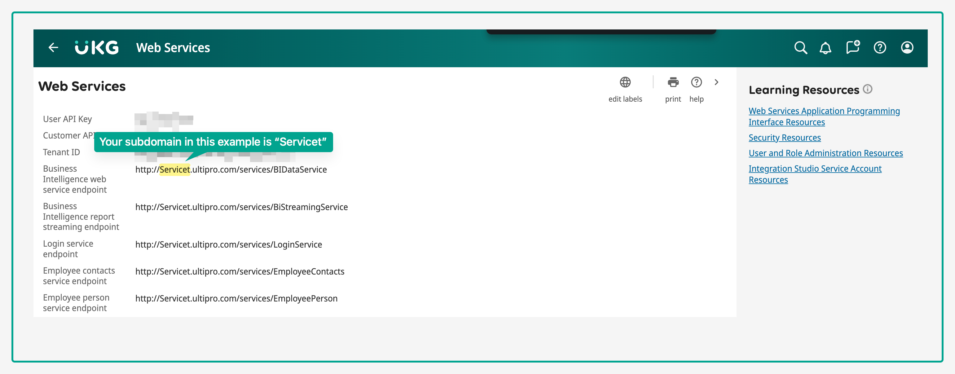 Look at any of the URLs on this page and copy one of them. For example your URL may look something like this: http://Servicet.ultipro.com/services/BIDataService