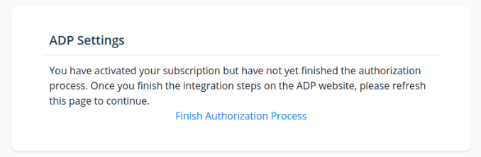 Click on Finish Authorization Process to grant consent to Compt so that your employees can be synced. This will take you to the authorization flow in ADP and will return you back to Compt.