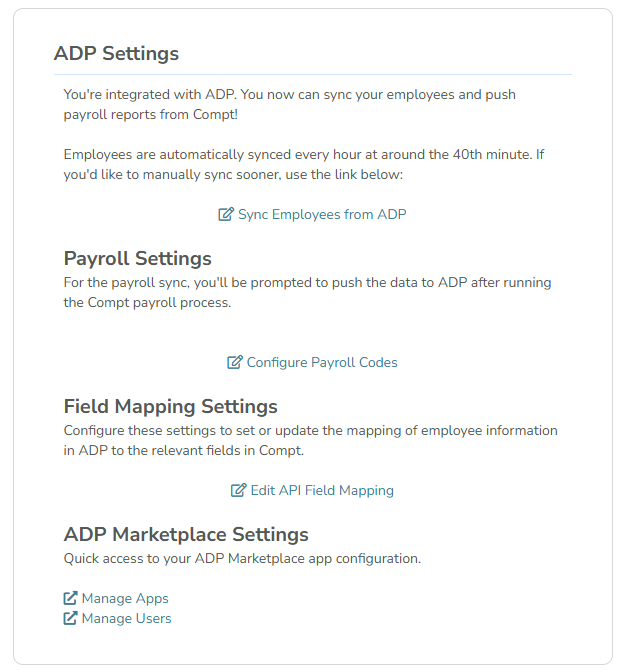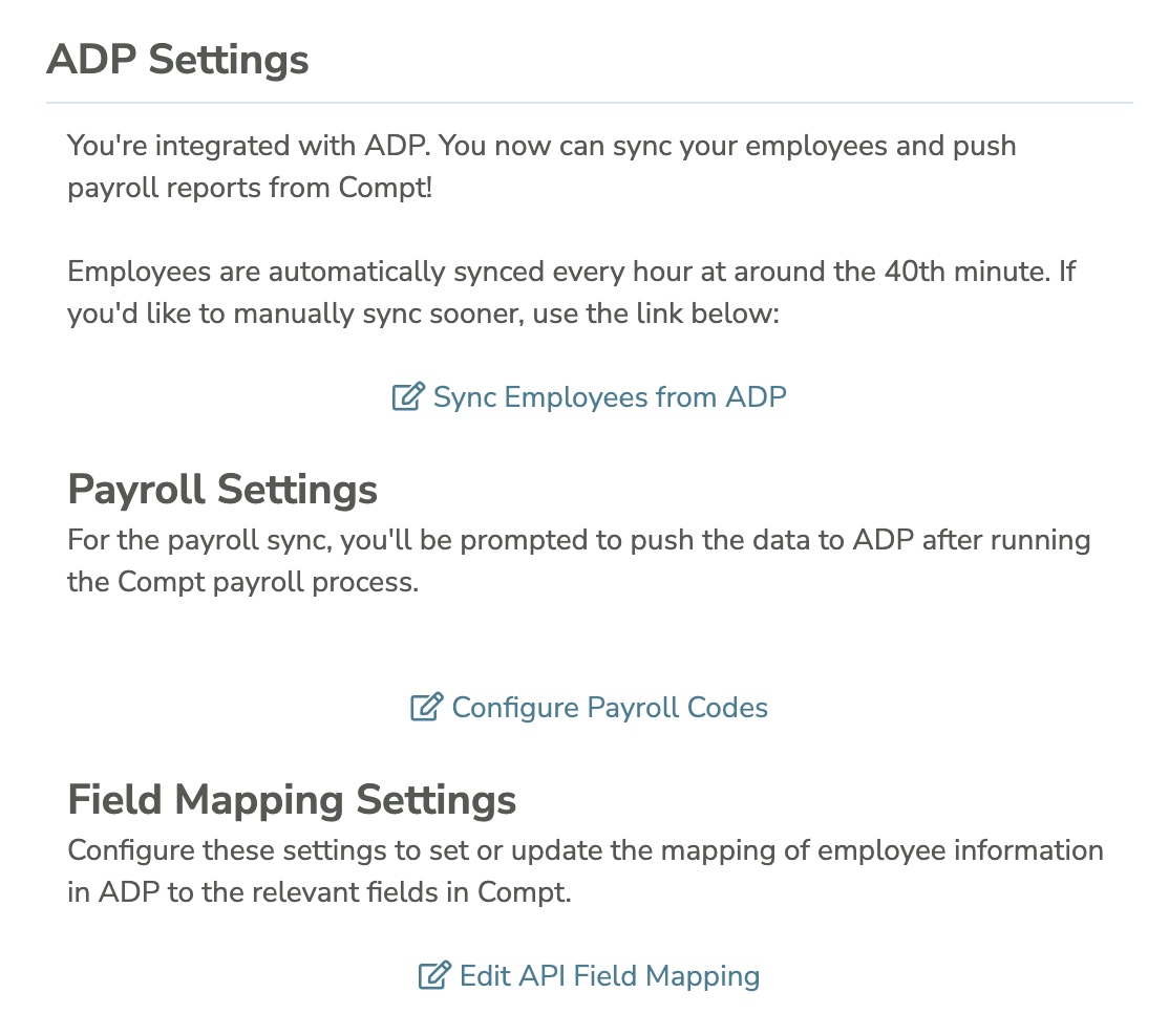 - You can monitor sync status directly in the ADP Settings section on the Company Settings page in Compt.